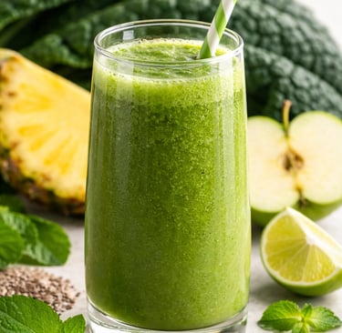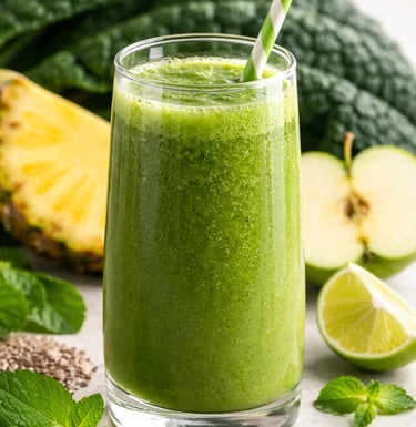 Bebida verde com fibras, vitaminas e minerais, que contribui para a digestão e para o conforto intestinal.
